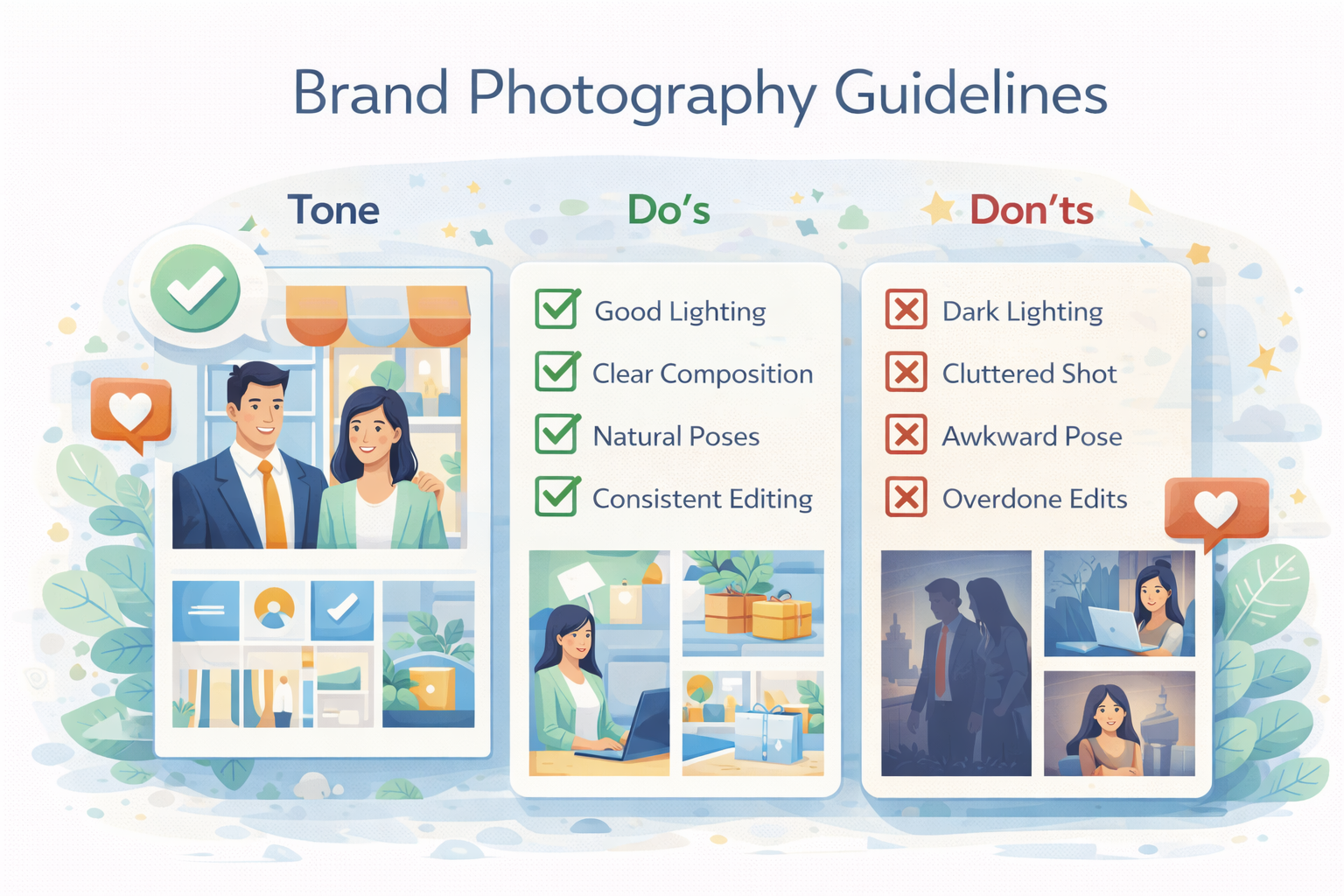 Photographers do not live inside your brand every day. Therefore, brand photography guidelines must be communicated clearly—even to long-term collaborators.